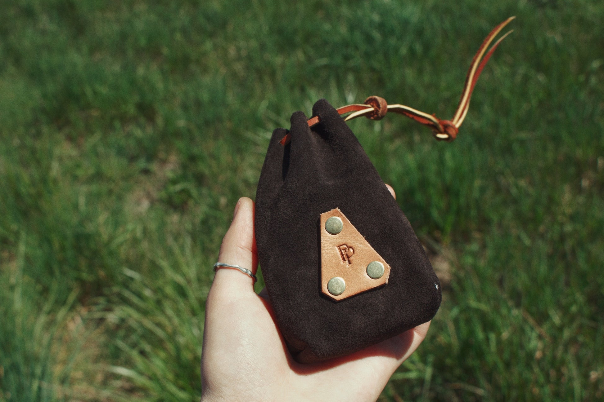 Leather drawstring pouches designed and handmade in the town of Mendocino, Ca. by Mendocino Shoe Works. Perfect little carrying case for both a pipe and a lighter or any other small items! Pouch has the PP stamped on the front with pure brass rivets. Leather is sourced from Napa County, made from suede split leather and the drawstring is made from latigo laces. Pouch is built to last, along with the pipe.